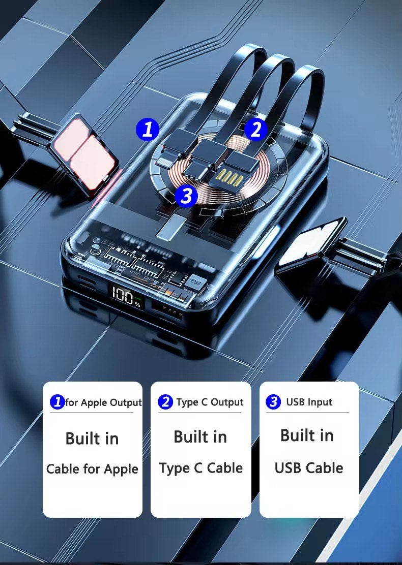 Built-in Cables: Integrated USB-C, Lightning, and Micro-USB cables—no more tangled cords or forgotten wires.